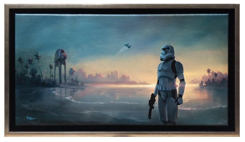 Scarif Forces by Rob Kaz. Print details: $150. Giclee on canvas. 495 piece edition. 17.4″ x 9.4″ frame.