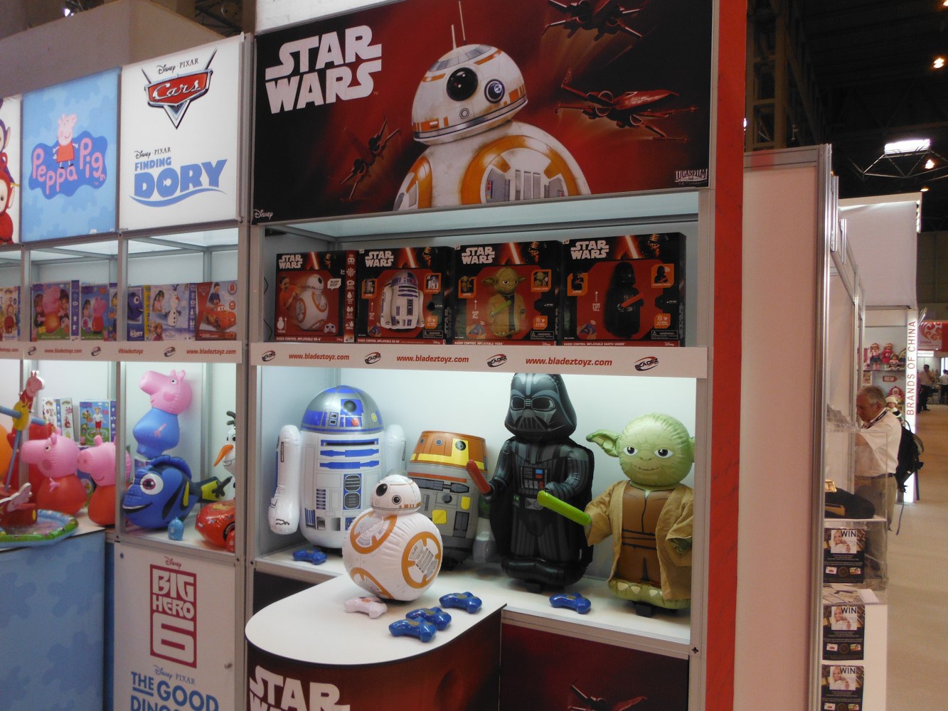 The Bladez Toyz Booth features four Star Wars radio controlled inflatables. They come in the flavors of R2-D2, Chopper, Darth Vader, Yoda, BB-8. Features for these inflatables include: