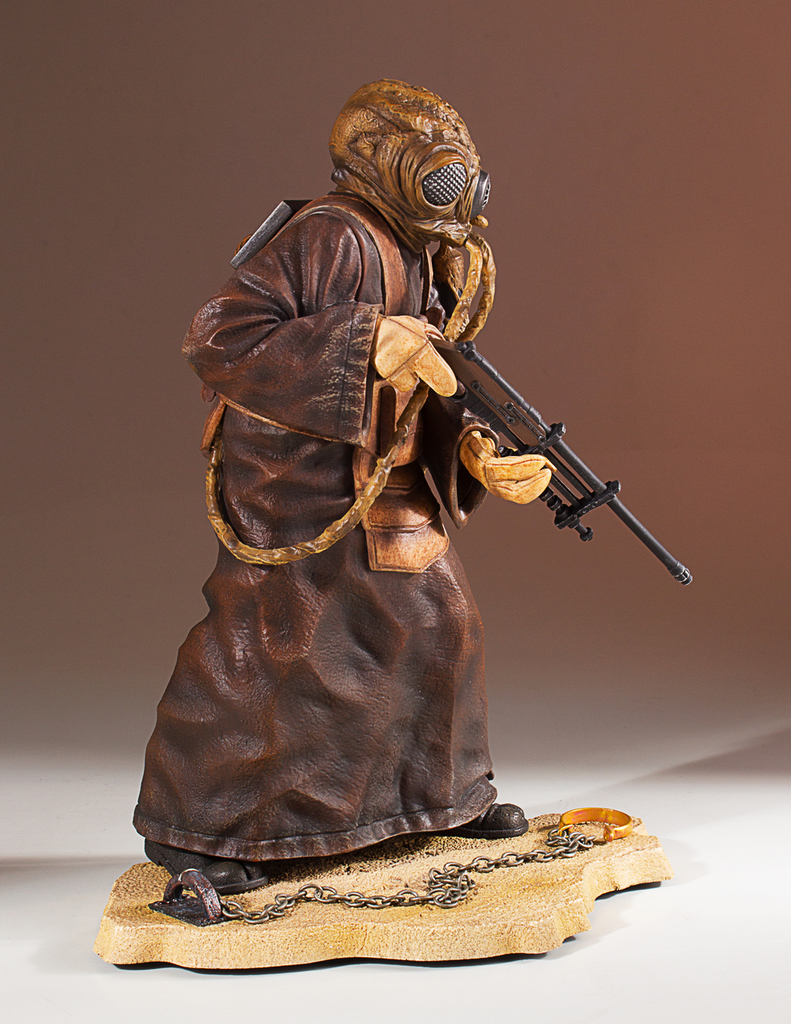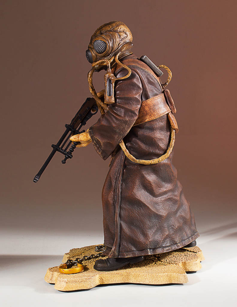 The artists a Gentle Giant take you on a journey to see the moments just following the events of the death of Jabba, we find Zuckuss on Tattoine, at his feet, a chain left by Jabba’s escaped prize. Zuckuss is still on the hunt, reading the clues, catching the trail with his GRS-1 Snare Rifle in hand. Where Zuckuss goes, can 4-LOM be far behind?