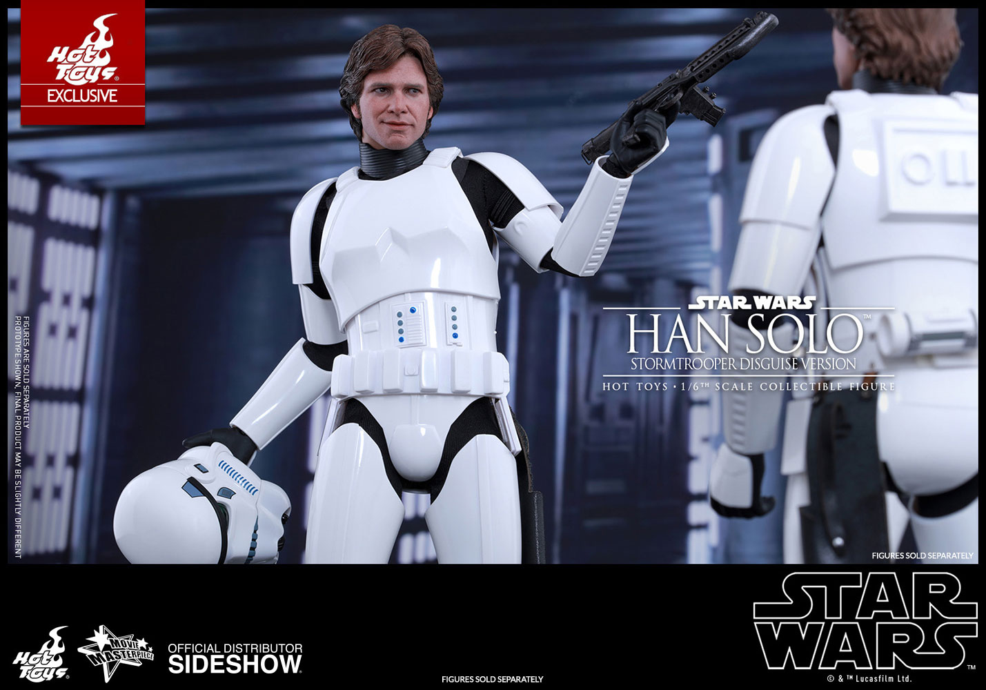 The highly-accurate collectible figure is specially crafted based on the image of Harrison Ford as Han Solo disguised as a Stormtrooper in Star Wars: Episode IV A New Hope. It features a newly developed head sculpt, finely tailored Stormtrooper armor, an interchangeable Stormtrooper helmet with a mechanically detailed interior, blaster rifle, a set of binders, figure stand, and a specially designed Death Star wall panel diorama backdrop with LED light-up function!