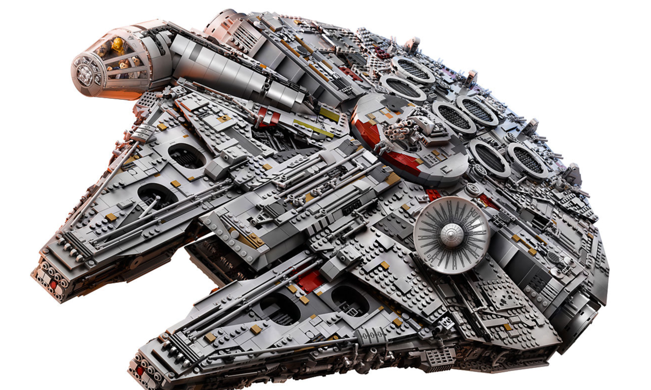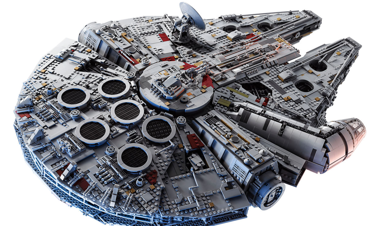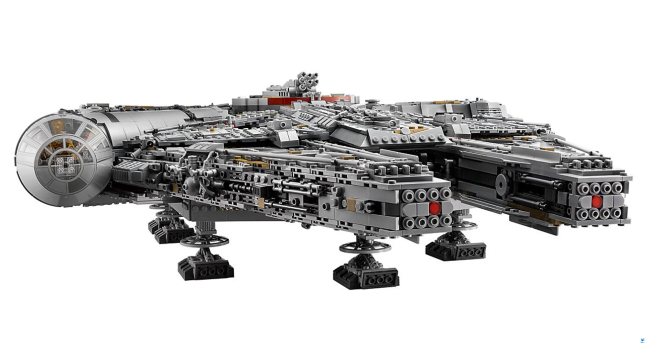 Welcome to the largest, most detailed LEGO® Star Wars Millennium Falcon model we’ve ever created—in fact, with over 7,500 pieces it is the biggest LEGO model ever sold! This amazing LEGO interpretation of Han Solo’s unforgettable Corellian freighter has all the details that Star Wars fans of any age could wish for, including intricate exterior detailing, upper and lower quad laser cannons, landing legs, lowering boarding ramp and a 4-minifigure cockpit with detachable canopy. Remove individual hull plates to reveal the highly detailed main hold, rear compartment and gunnery station. This amazing model also features interchangeable sensor dishes and crew, so you decide whether to play out classic LEGO Star Wars adventures with Han, Leia, Chewbacca and C-3PO, or enter the world of Episode VII and VIII with older Han, Rey, Finn and BB-8!