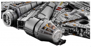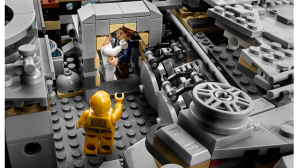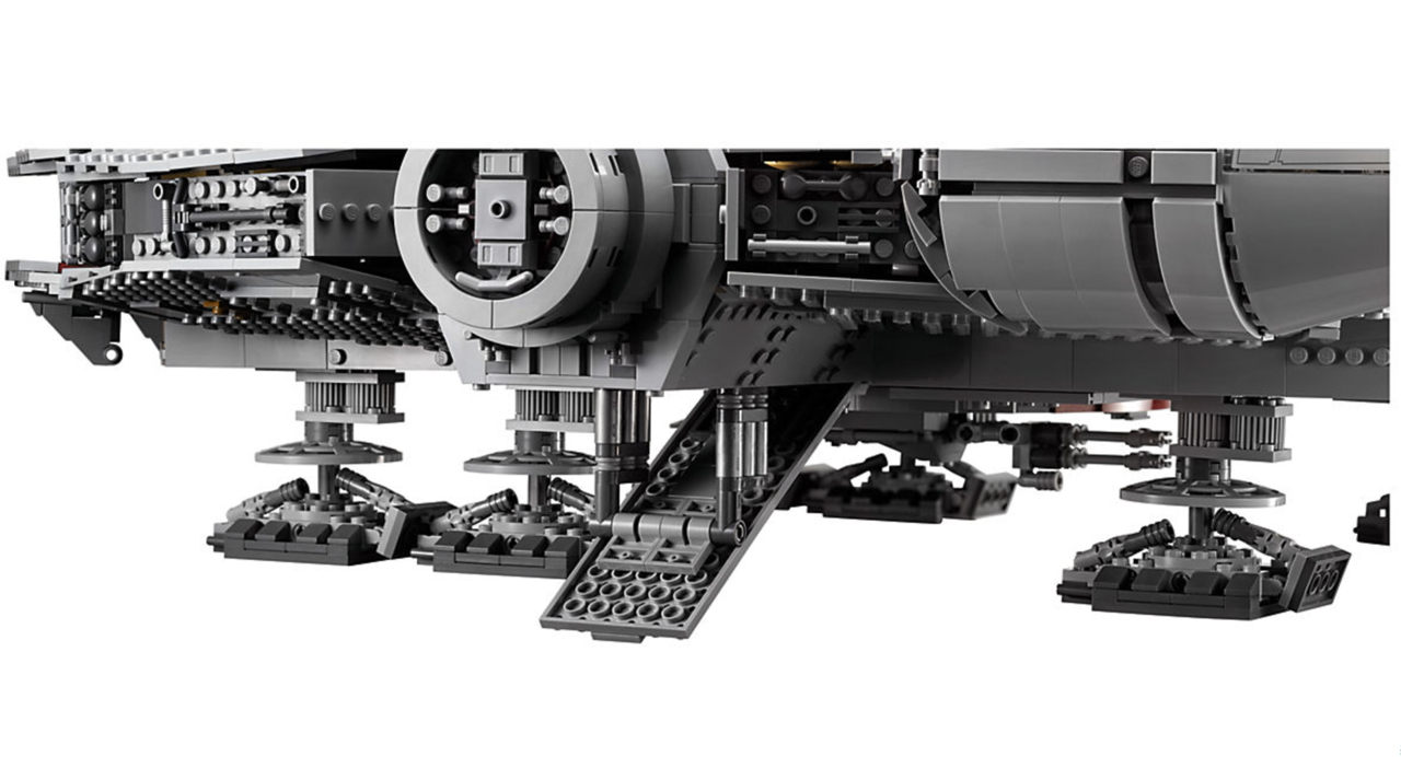 Lego previously released a Millennium Falcon as part of their UCS line a few years ago but this one is much bigger, more detailed and complex, making use of new pieces and different techniques to create a model that looks even more impressive and realistic. Furthermore, it has parts of a detailed interior, as seen in the photos, unlike the previous release, which are accessible by removing parts of the roof structure and has enough space to comfortably seat the figures. These include the gun station, cockpit, part of the corridor seen in TESB, the seating area with holochess table and the room where Finn and Rey attempt to make repairs in TFA. It also features a working boarding ramp, 7 landing legs and concealed blaster cannon. If you want an even closer look at these intricate details on the model then the designer video for the set has also been released.