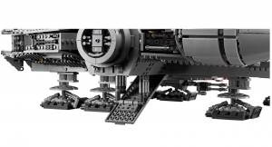 - Exterior features include intricately detailed and removable hull panels, a lowering boarding ramp, concealed blaster cannon, 4-minifigure cockpit with detachable canopy, interchangeable round/rectangular sensor dishes, upper and lower quad laser cannons, and 7 landing legs.