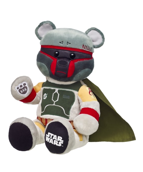 Join the bounty hunters with this Boba Fett Bear. This bounty hunter bear is ready for adventure in the Outer Rim. He comes dressed in his armor and cape. Add Star Wars sounds to make the ultimate Star Wars gift.