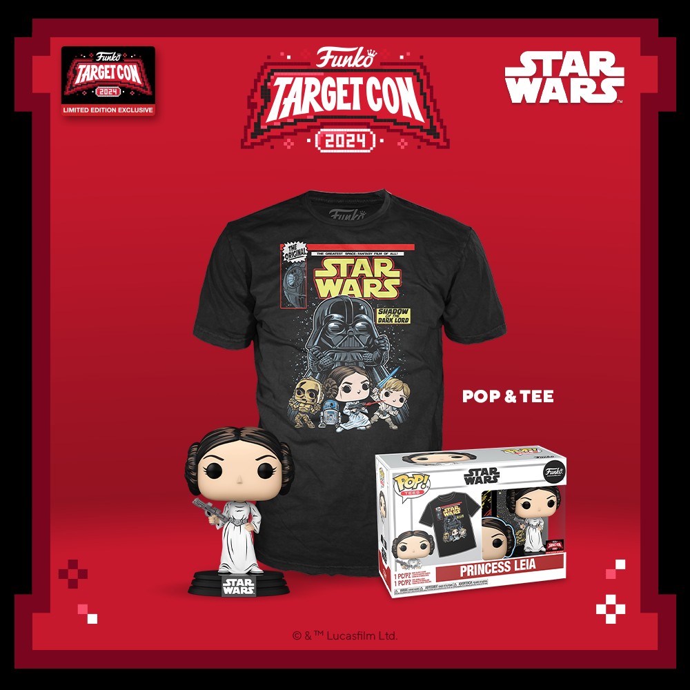 Upgrade your retro STAR WARS collection and wardrobe with the Target Con exclusive Pop! & Tee Bundle. This combo includes a retro edition of Pop! Princess Leia and a tee to match with Pop! art and retro elements. Get yours at target.com starting 2/18!