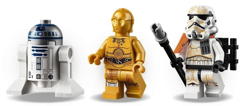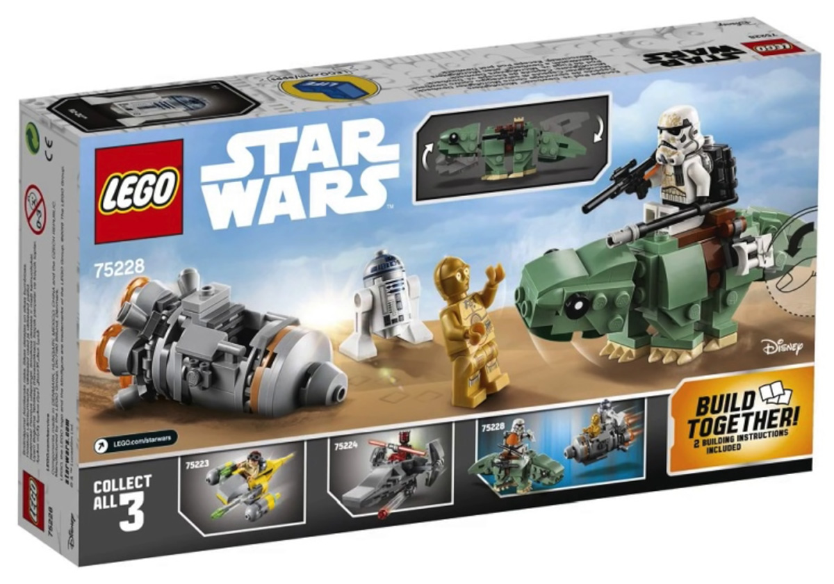 - Escape Pod vs. Dewback Microfighters (#75228) — Escape Pod, Dewback and two minifigures, Sandtrooper (new helmet design), C-3PO and R2-D2; 176 pieces for $19.99.