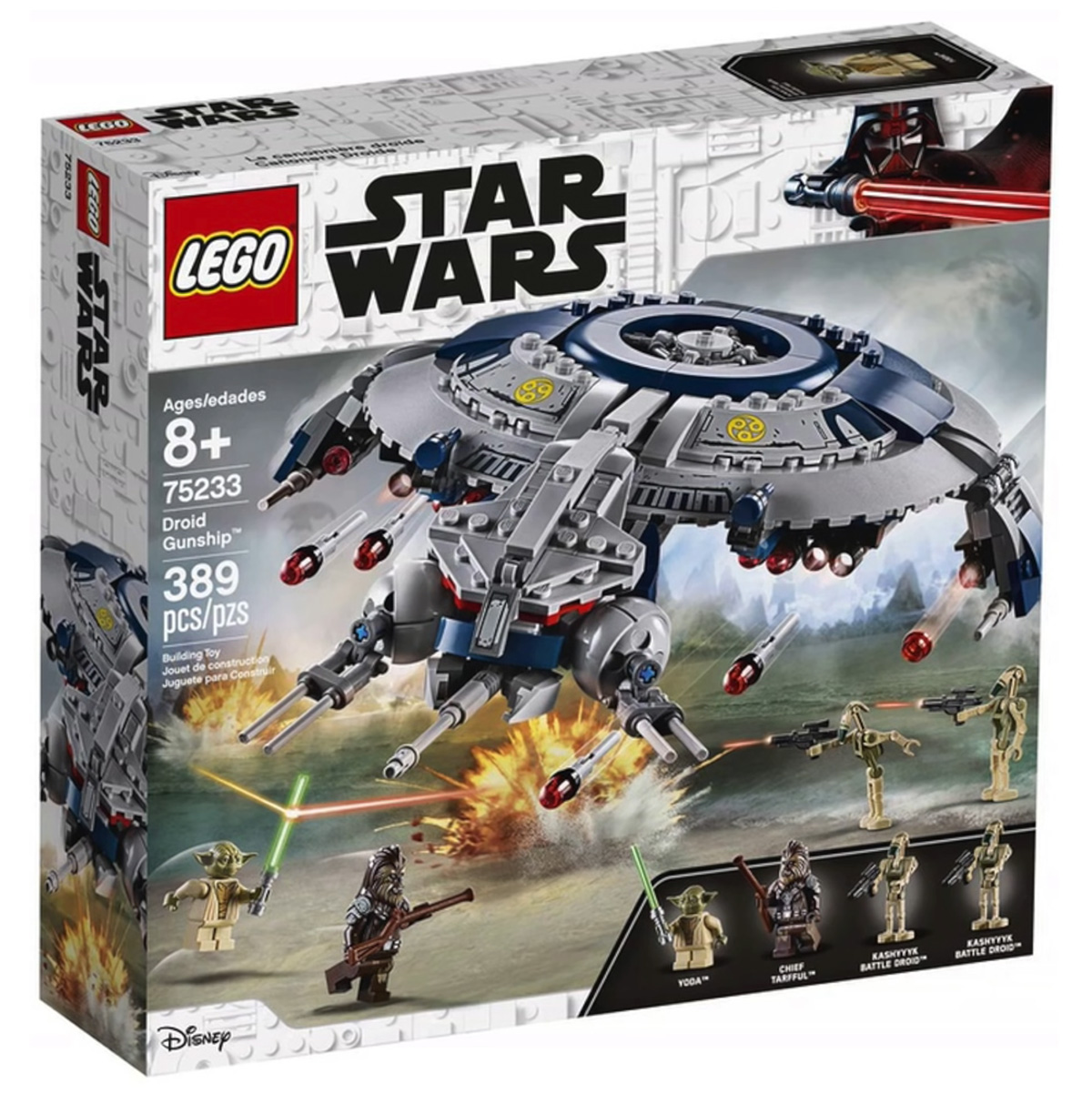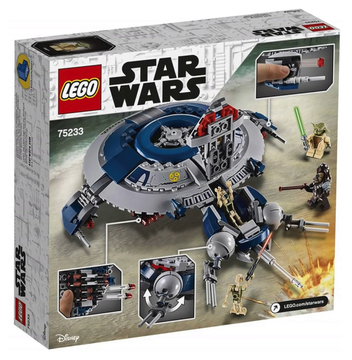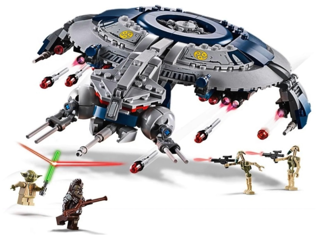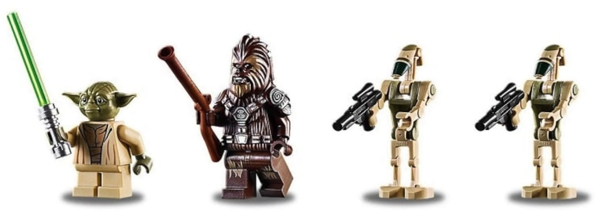 - Droid Gunship (#75233) — includes Droid Gunship with eight dual flick missiles, two wing-mounted stud shooters and four minifigures of Chief Tarfful, Yoda & two new Kashyyyk decorated Battle Droids; 389 pieces for $49.99.