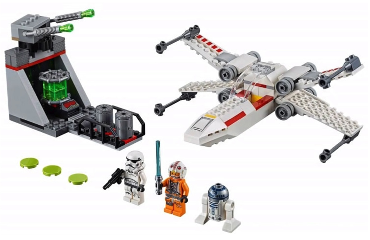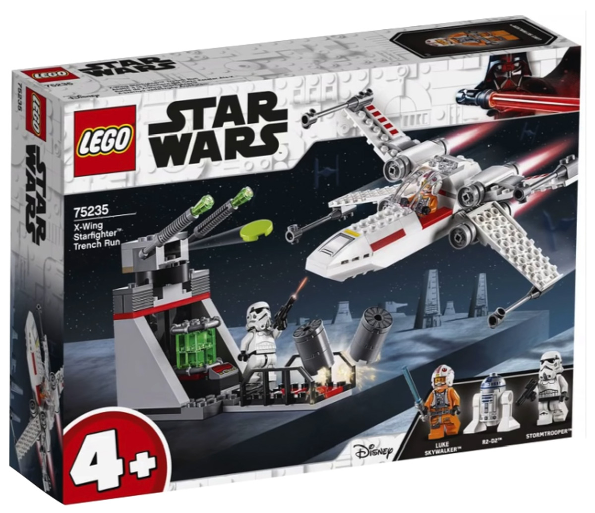 - X-Wing Starfighter Trench Run (#75235) — X-Wing Starfighter, Turret with firing disc shooters and two minifigures of Luke Skywalker in his X-Wing Pilot Suit, Stromtrooper (new helmet design) and R2-D2; 132 pieces for $29.99.