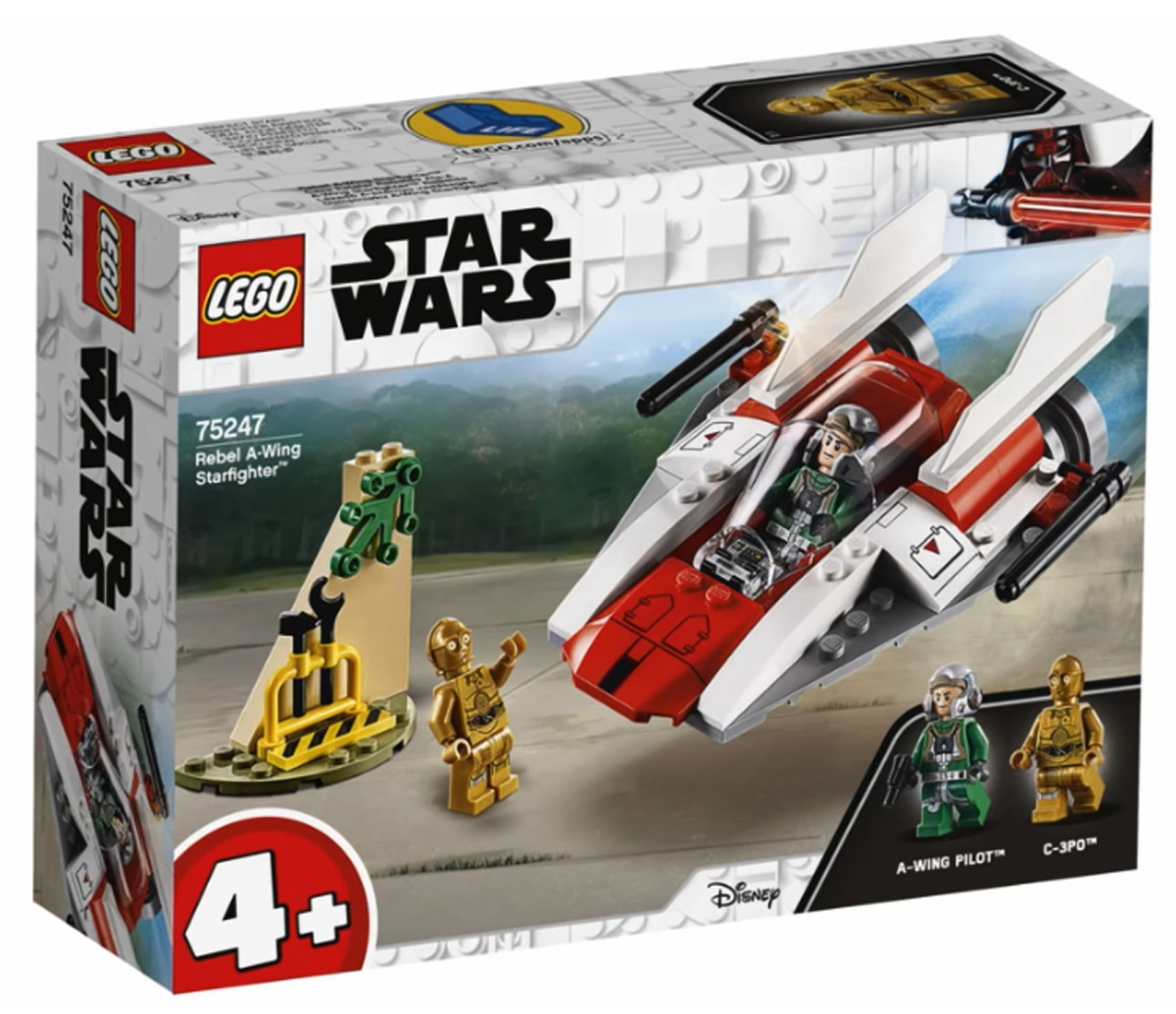- Rebel A-Wing Starfighter (#75247) — A-Wing Starfighter with two minifigures, A-Wing Pilot and C-3PO; 62 pieces for $19.99.