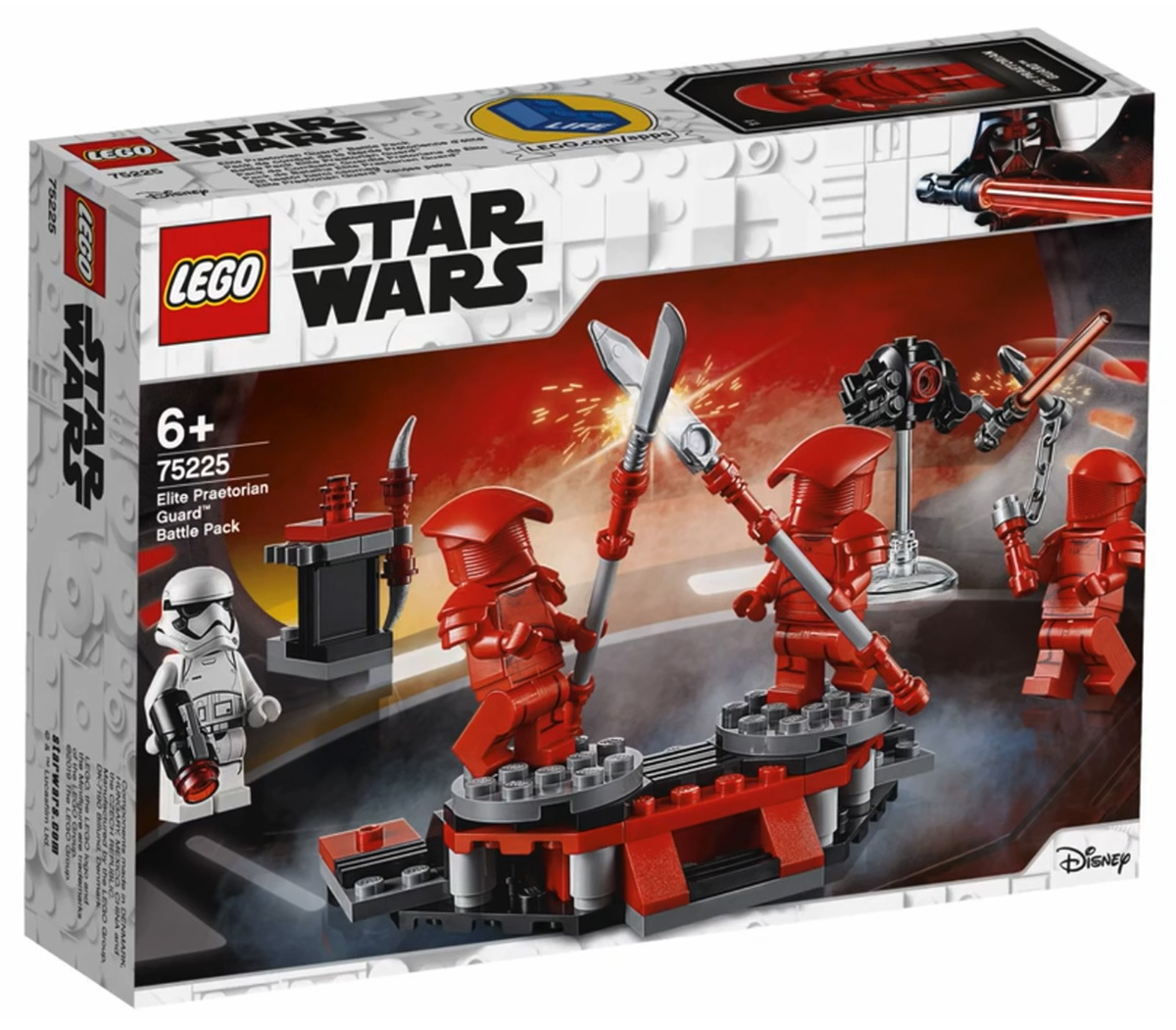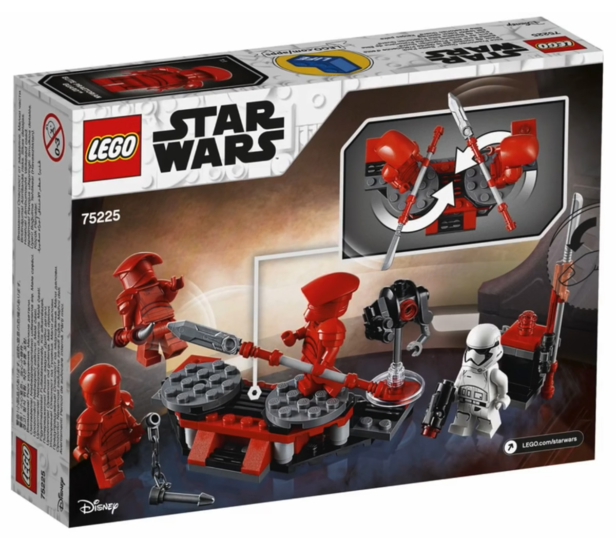- Elite Praetorian Guard Battle Pack (#75225) — includes one First Order Stormtrooper and three Praetorian Guards (two different helmets), spinning battle platform and training droid; 109 pieces for $14.99.