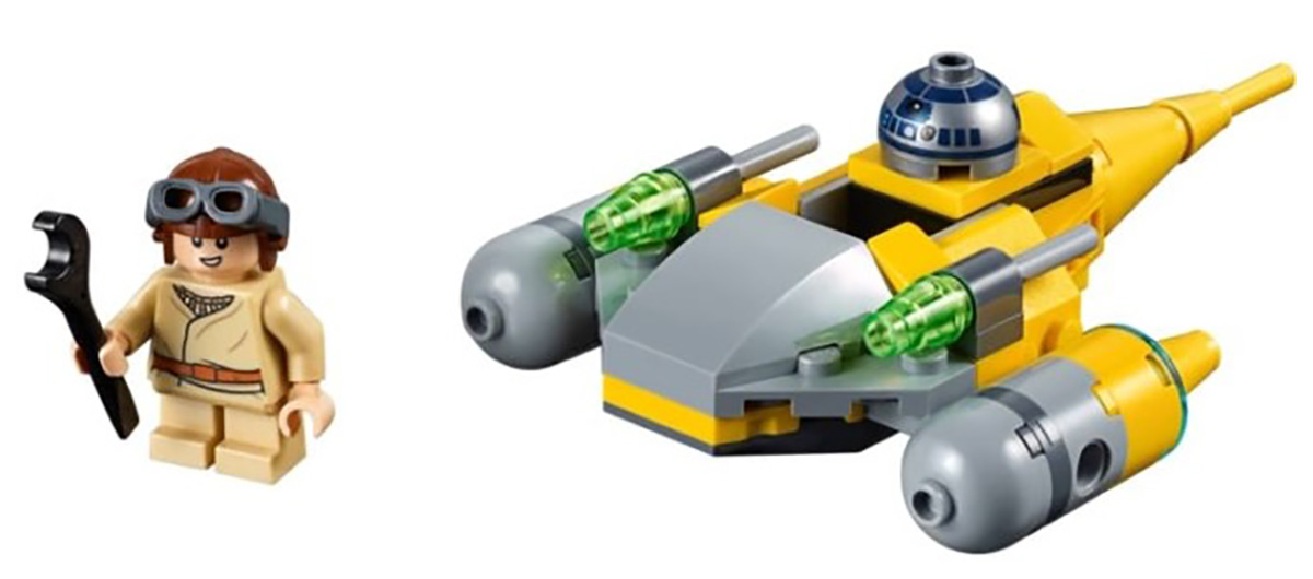 - Naboo Starfighter Microfighter (#75223) — Naboo Starfighter with Young Anakin minifigure and R2-D2 dome; $9.99.