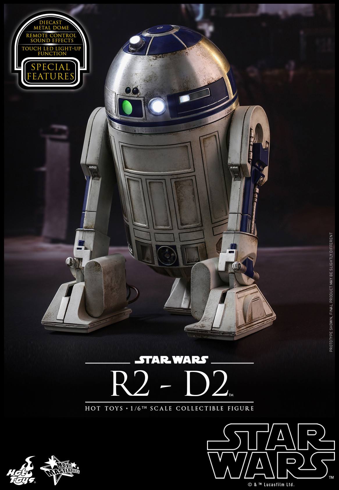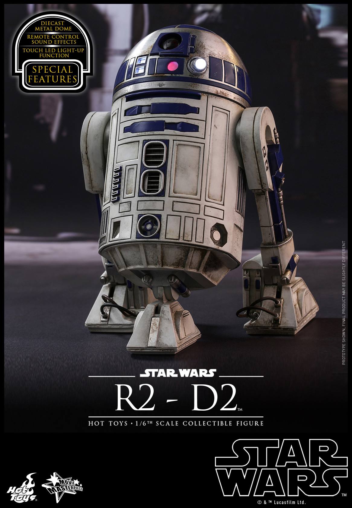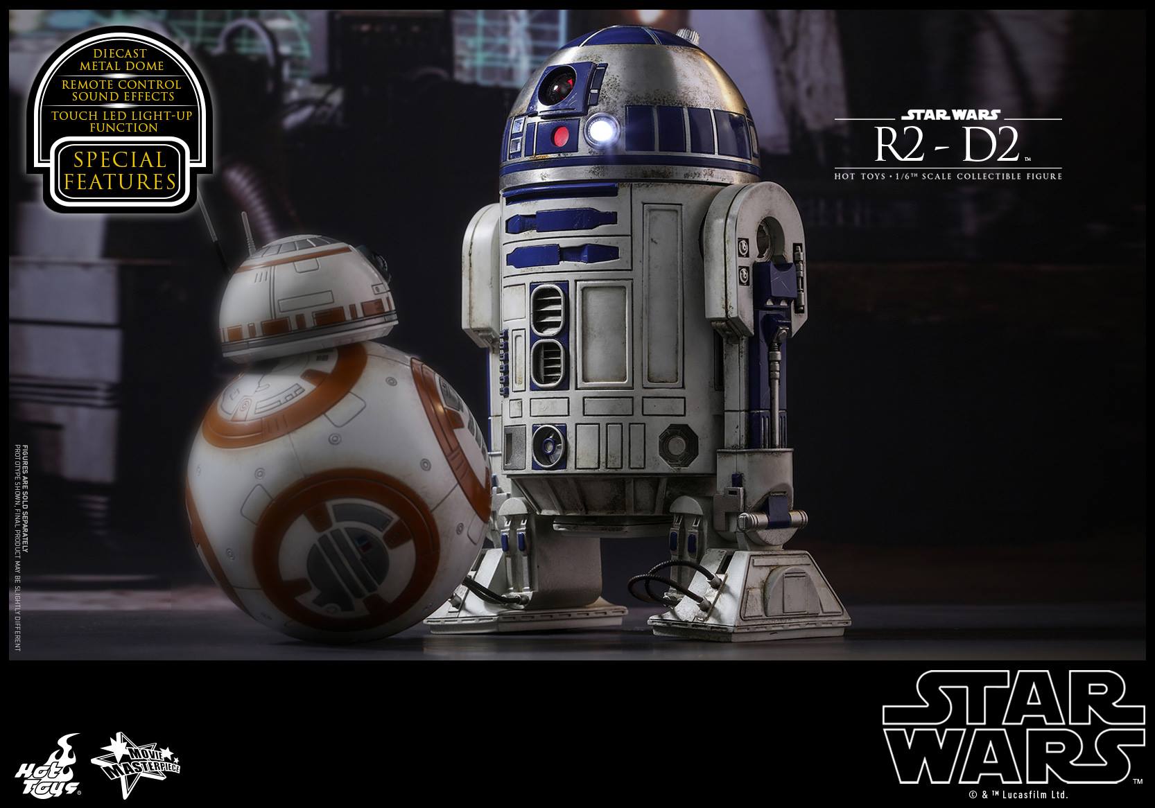 The astonishing collectible figure is specially crafted based on the appearance of R2-D2 in Star Wars: The Force Awakens. It features a highly detailed mechanical construction with weathering effects, meticulously crafted diecast metal dome, touch LED light-up functions, and remote controlled sound effect function featuring 12 iconic R2-D2 sounds!