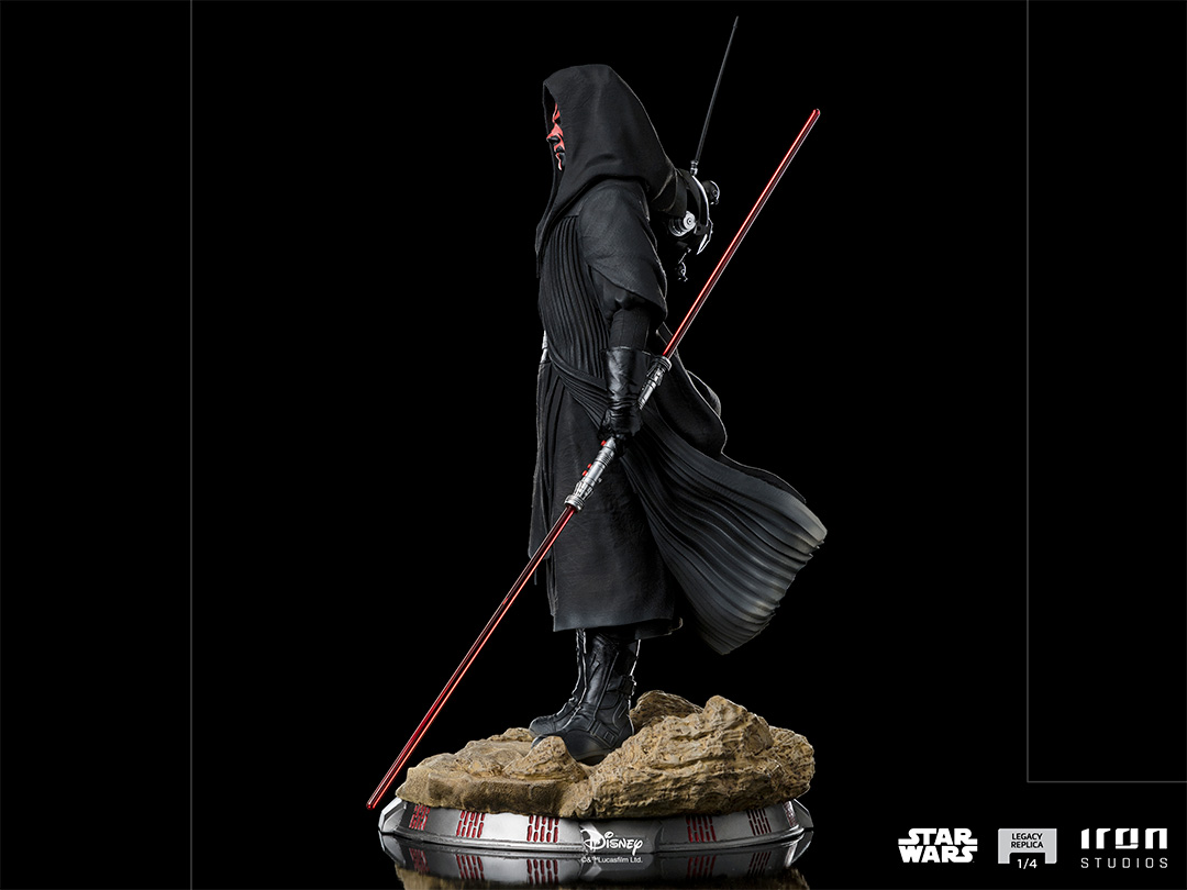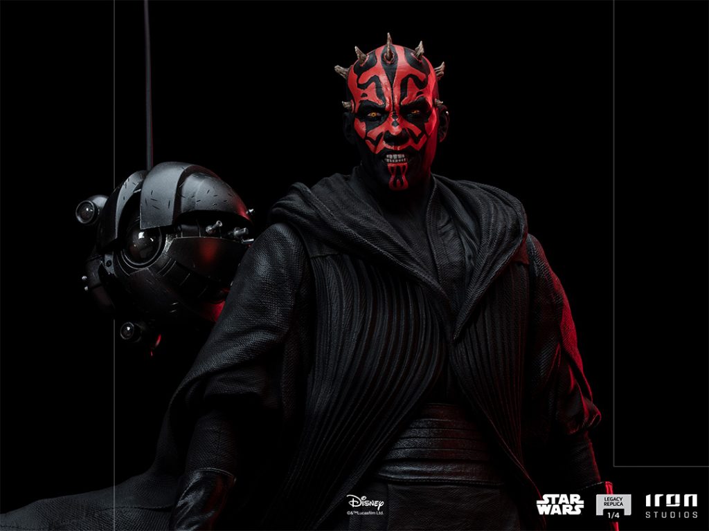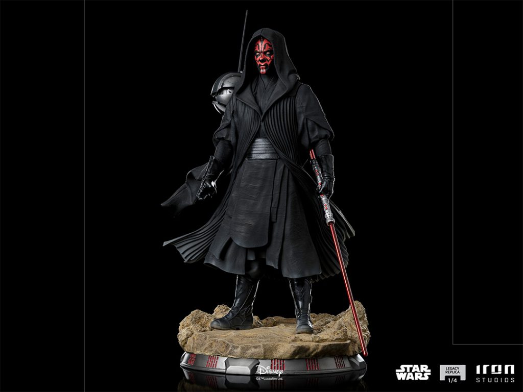 Sent by his master Darth Sidious to the barren planet Tatooine with the mission of eliminating Queen Amidala and the two Jedi Knights, protectors of the ruler from planet Naboo, the mortal and agile Sith Lord with yellow eyes and red tattooed face under a crown of horns, wielding his double-bladed Lightsaber and wearing his dark cloak fluttering on the desert winds, gets ready to face one of his targets, after getting the location of his target’s whereabouts from his Probe Droid next to him. In the month of May, commemorating the Star Wars saga, Iron Studios proudly present their statue “Darth Maul – Star Wars – Legacy Replica 1/4”, with his most iconic look just like on his unforgettable premiere in the movies in “Star Wars: Episode I – The Phantom Menace”, one of the most beloved Star Wars villains for the first time in this scale by Iron Studios, fiercely and intriguingly represented as the greatest Zabrak warrior from Dathomir.