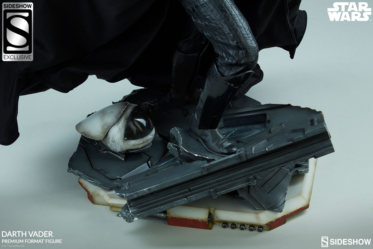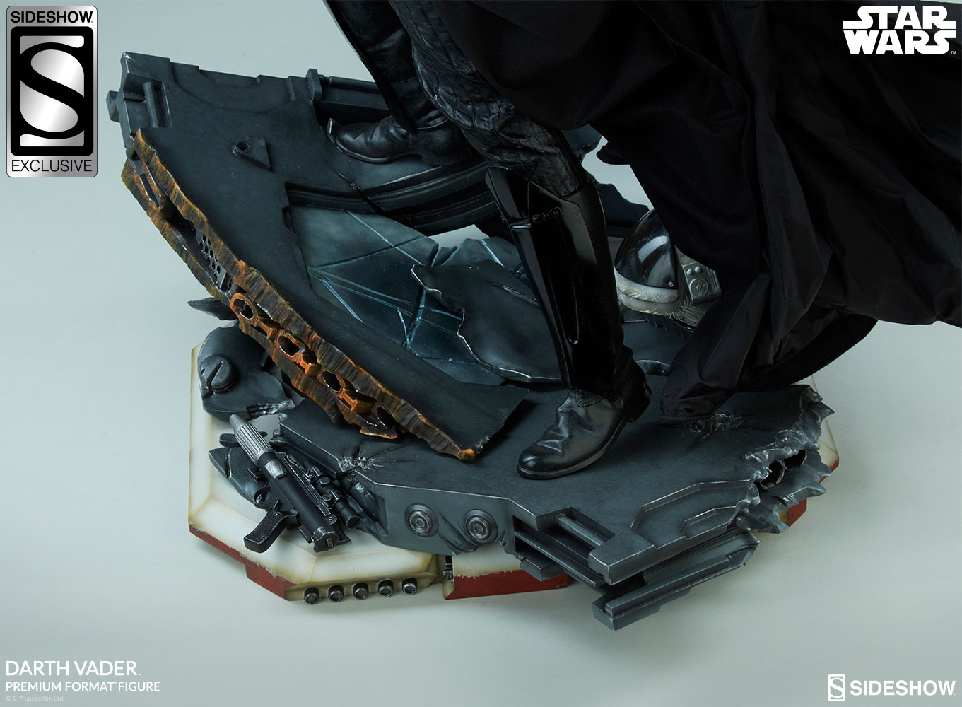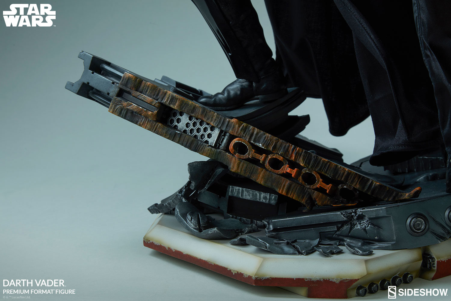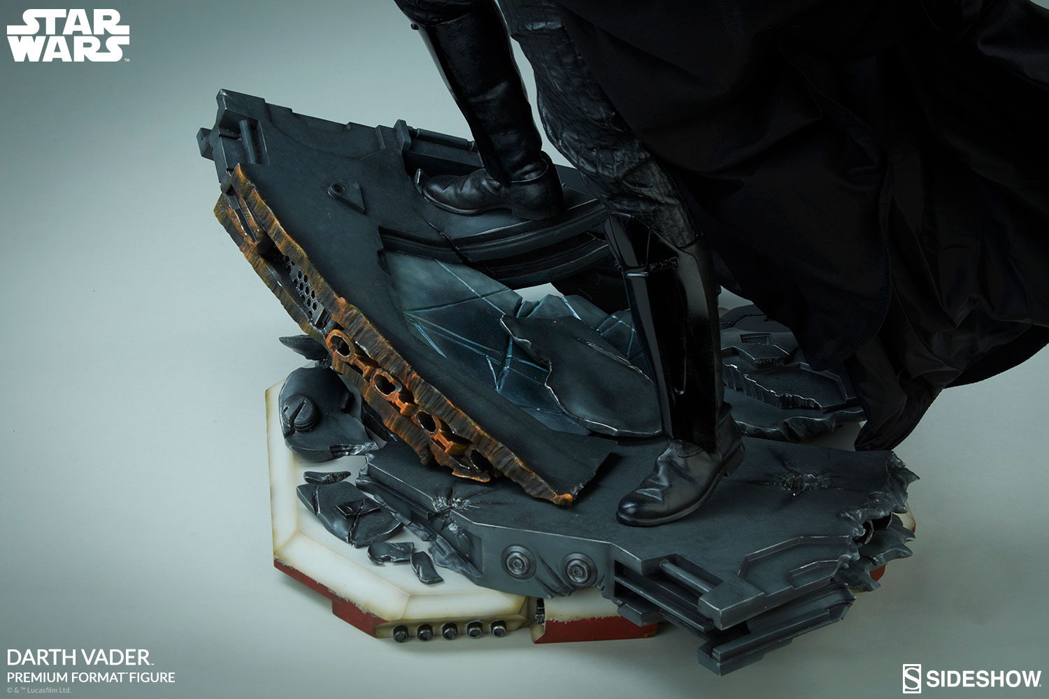 The Darth Vader Premium Format™ Figure measures just over 25” tall, as the Sith lord stands among the remains of a Rebel command ship base. Torn apart by his fury and lightsaber, the exposed mechanical insides of the ship still smolder with painted details of heated metal and shattered flooring.