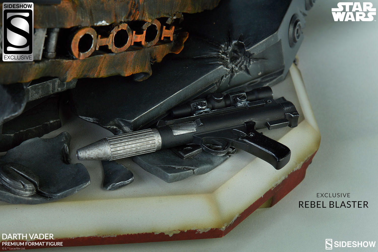 The Exclusive Edition of the Darth Vader Premium Format™ Figure includes a Rebel helmet and blaster that can be placed on the base, adding to the destruction and chaos caused by this dark lord of the Sith.