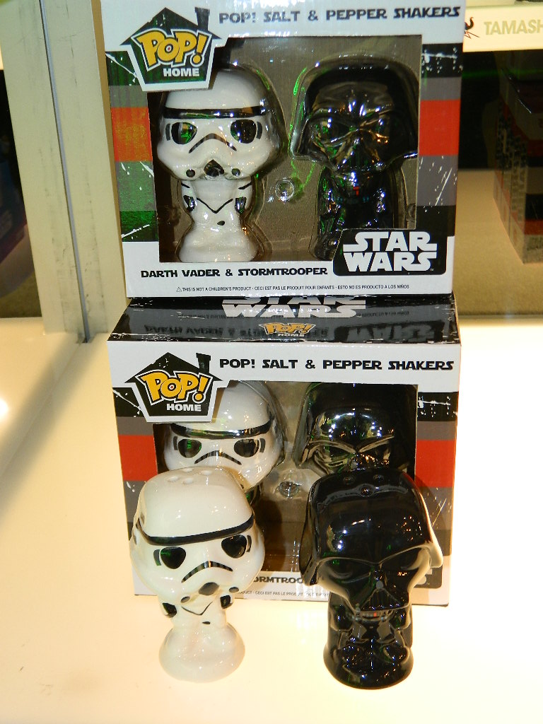 On display the company showcased several Star Wars themed tee shirts, the Stormtrooper and Darth Vader Salt & Pepper shakers, and a BB-8 mug. The company did show off their upcoming Star Wars Mymoji figures, which are sort of cool, and take up little display space.