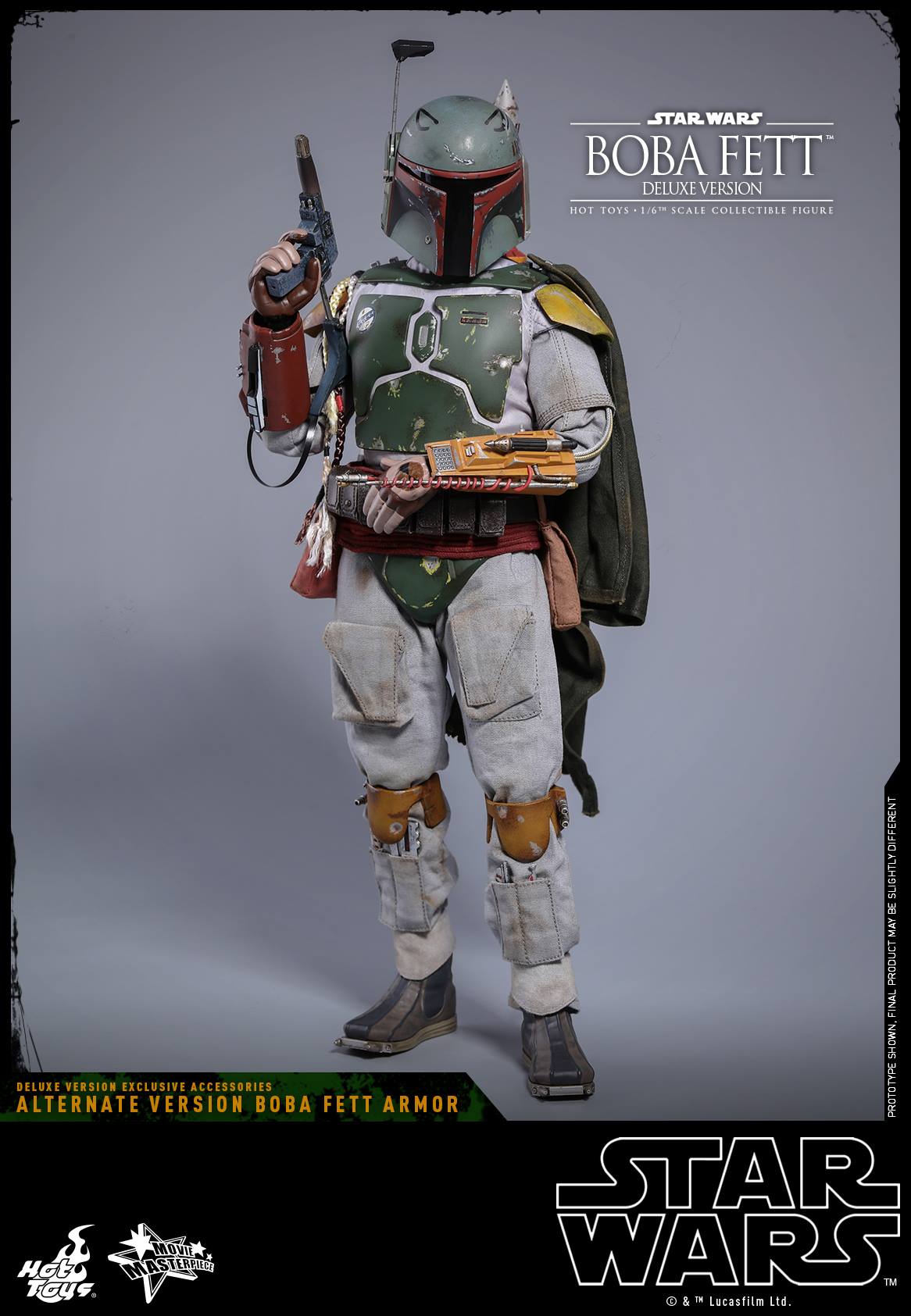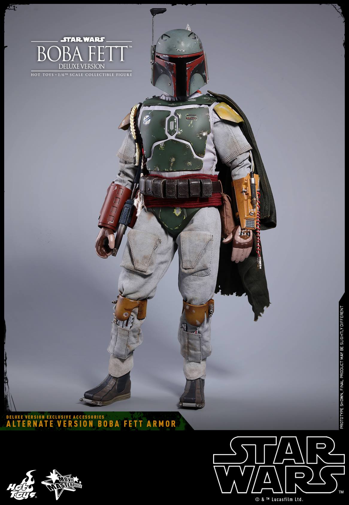 The biggest highlight of this Deluxe Version is none other than the fact that Boba Fett’s Alternate Version armor based on his “movie pre-production” look is realized for the first time on a 1/6th scale collectible figure and exclusively include a range of interchangeable parts such as helmet, jetpack, gauntlets, cape, and a number of gloved hands for fans to display this infamous bounty hunter’s stylistic look before his official appearance in Star Wars: The Episode V The Empire Strikes Back!