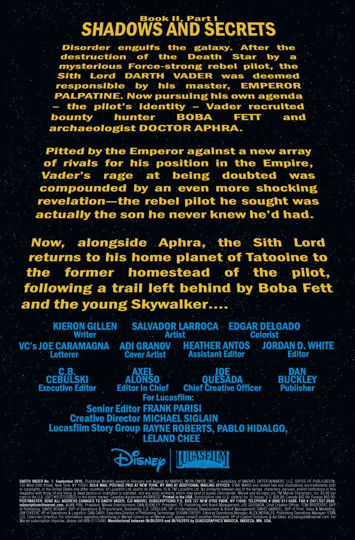 The Emperor’s machinations revealed! Everything changes for Vader! The tale of Vader’s transformation from A New Hope to The Empire Strikes Back continues! Star Wars © Lucasfilm Ltd. & TM. All rights reserved. Used under authorization. Text and illustrations for Star Wars are © 2015 Lucasfilm Ltd.