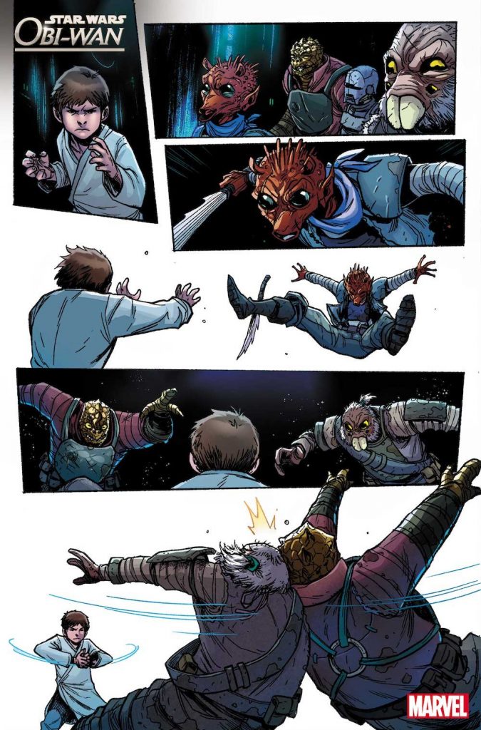 Today we have our first look at the series, thanks to SyFy Wire. Each issue of the upcoming comic will feature a different adventure from a different period in Kenobi’s life, beginning with the issue #1 tale of an eight-year-old Kenobi launched into an adventure in the Coruscant underworld.