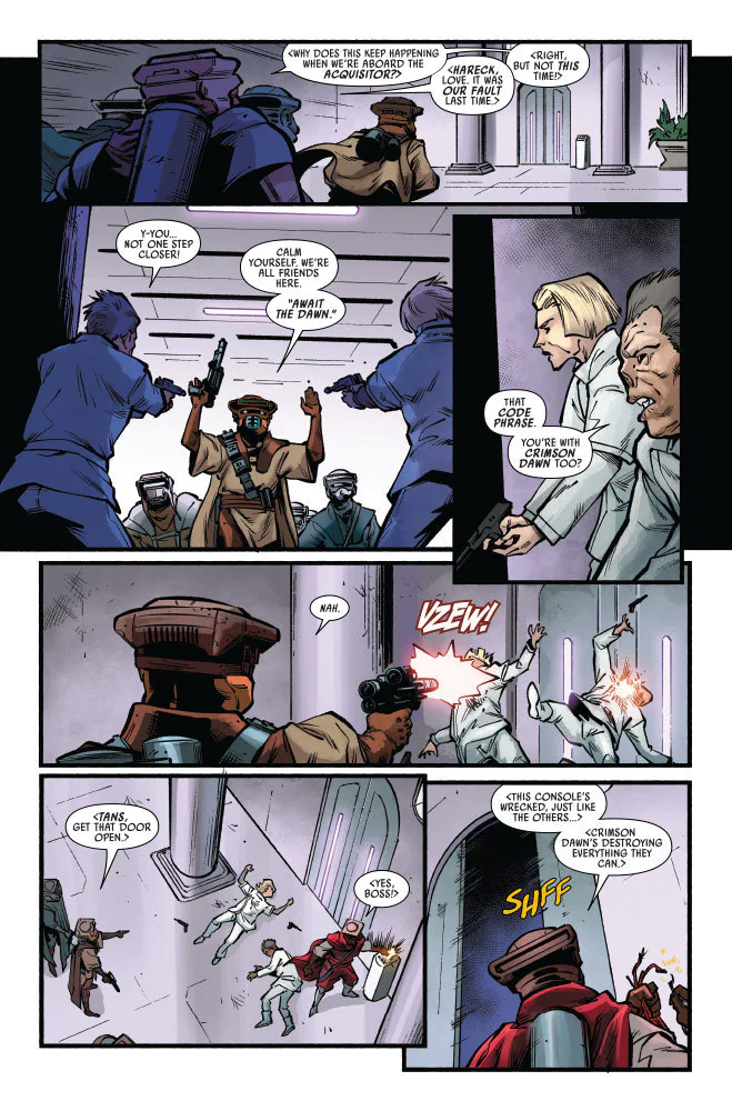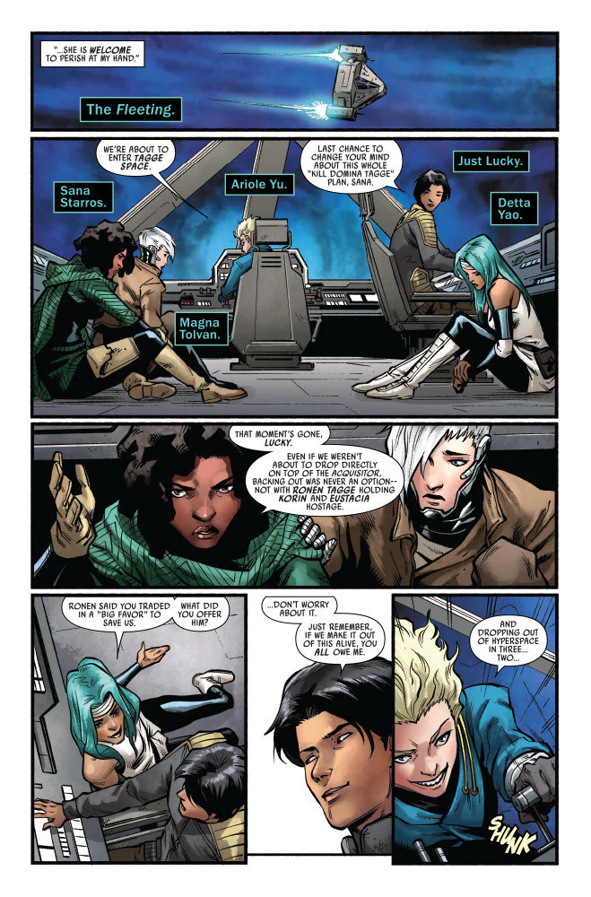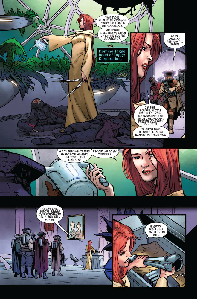 CODE OF HONOR! The enemy of my enemy is my friend…or so they say! As RONEN TAGGE and DOMINA TAGGE clash over the TAGGE CORPORATION, SANA STARROS is caught in the middle! But if there’s one thing she’s learned from DOCTOR APHRA, it’s how to use every situation to her advantage – and no matter which Tagge wins, Sana’s determined to come out on top!