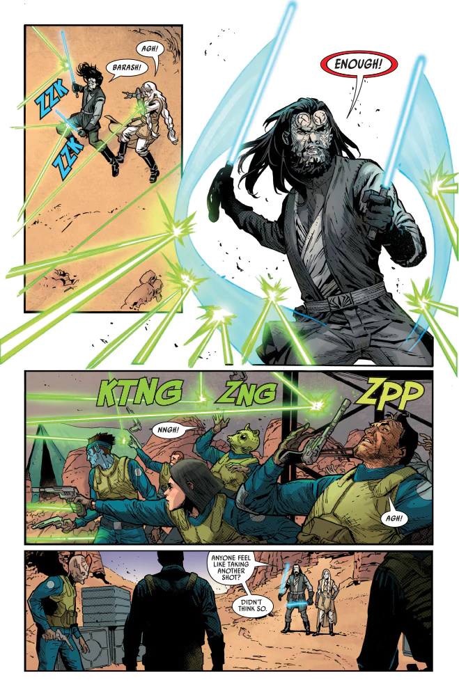 Porter calmly deflects his assailants with an impressive swish of spinning blades until one blaster bolt hits its target…