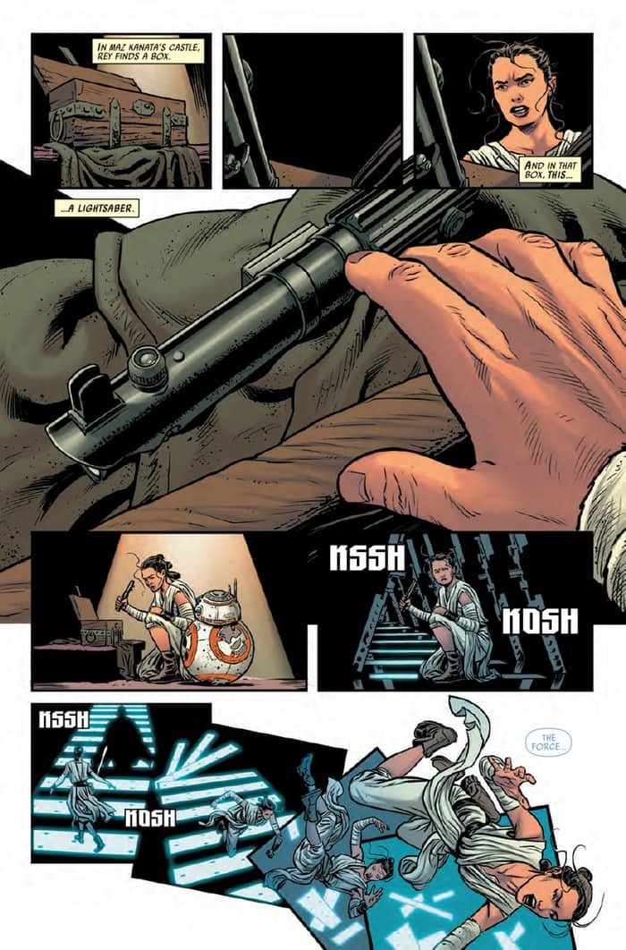 Rey, Finn, Han and Chewie have reached Maz Kanata’s castle…  …but the Force is calling Rey to Luke’s lightsaber!  Meanwhile, our heroes have been discovered! The First Order strikes!