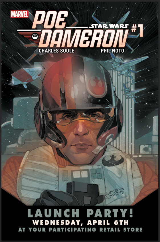 The best pilot in the galaxy is ready to take comics by storm, and Marvel is making sure comic book stores worldwide are stocked up with enough materials to make STAR WARS: POE DAMERON #1 one of the biggest launches of the year. Each retailer opting into the POE DAMERON #1 CELEBRATION (FEB160756) will receive a party kit from Marvel, containing exclusive promotional materials including party exclusive variant covers, promotional buttons, cake toppers and more. Retailers, check your Marvel Mailer for additional information on how to opt-in by 03/07 and ensure your store is prepared.