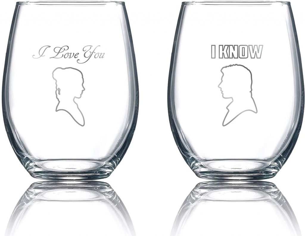Picture this… It’s Valentine’s Night, you and your significant other are setting the mood, and you bring out the Star Wars Wine Glasses featuring Leia and Han, and their loving words to each other just before Han takes a cold carbonite bath. There is nothing they wouldn’t do for you after sipping from these glasses!