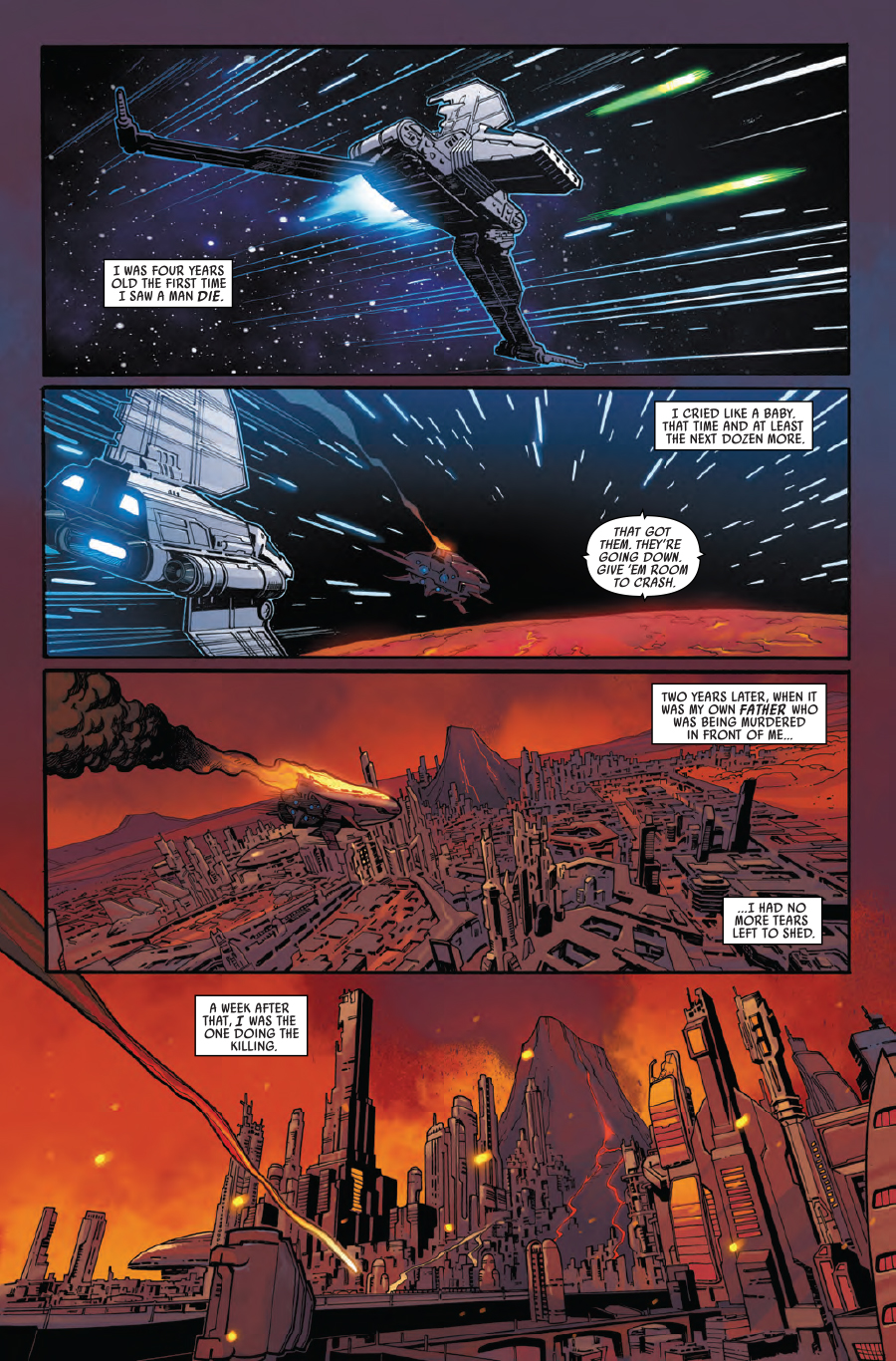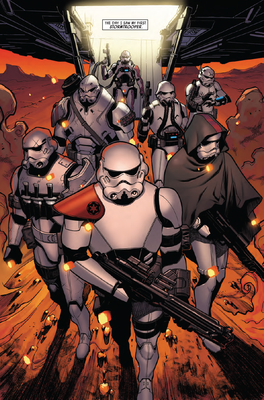 “The Last Flight of the Harbinger” STARTS NOW! Sgt. Kreel is back with an all-new squad of stormtroopers! Go inside the minds of an elite group of Imperial soldiers! Join incoming artist Jorge Molina for a walk on the dark side!