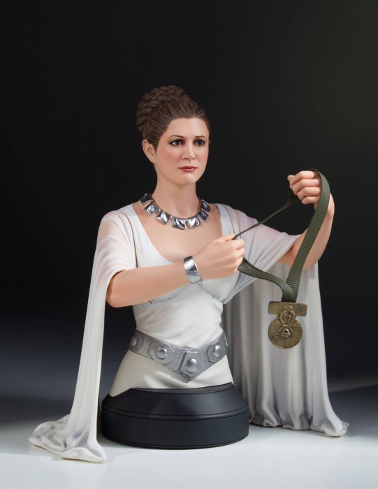 In the triumphant scene at the end of Star Wars: A New Hope, we see Princess Leia decorating Luke Skywalker and Han Solo with the Medal of Yavin, for their gallant effort that resulted in the destruction of the Imperial Death Star! Our previous releases include both Han Solo and Luke Skywalker. Now we complete the trilogy with the royal presenter herself, Princess Leia Organa of Alderan. This amazing mini bust illustrates the pride that Leia shows at the end of the film as she knows the Death Star has been destroyed and no other planets will face the same fate as her home world. She stands proudly on the stage with her fellow heroes of the Rebellion. This mini bust was digitally sculpted by our master artisans, using actual archival footage and designs. Each bust is rendered using the highest quality polystone, and is hand painted to exacting detail. All of the pieces in this series are individually numbered and paired with a matching certificate of authenticity.