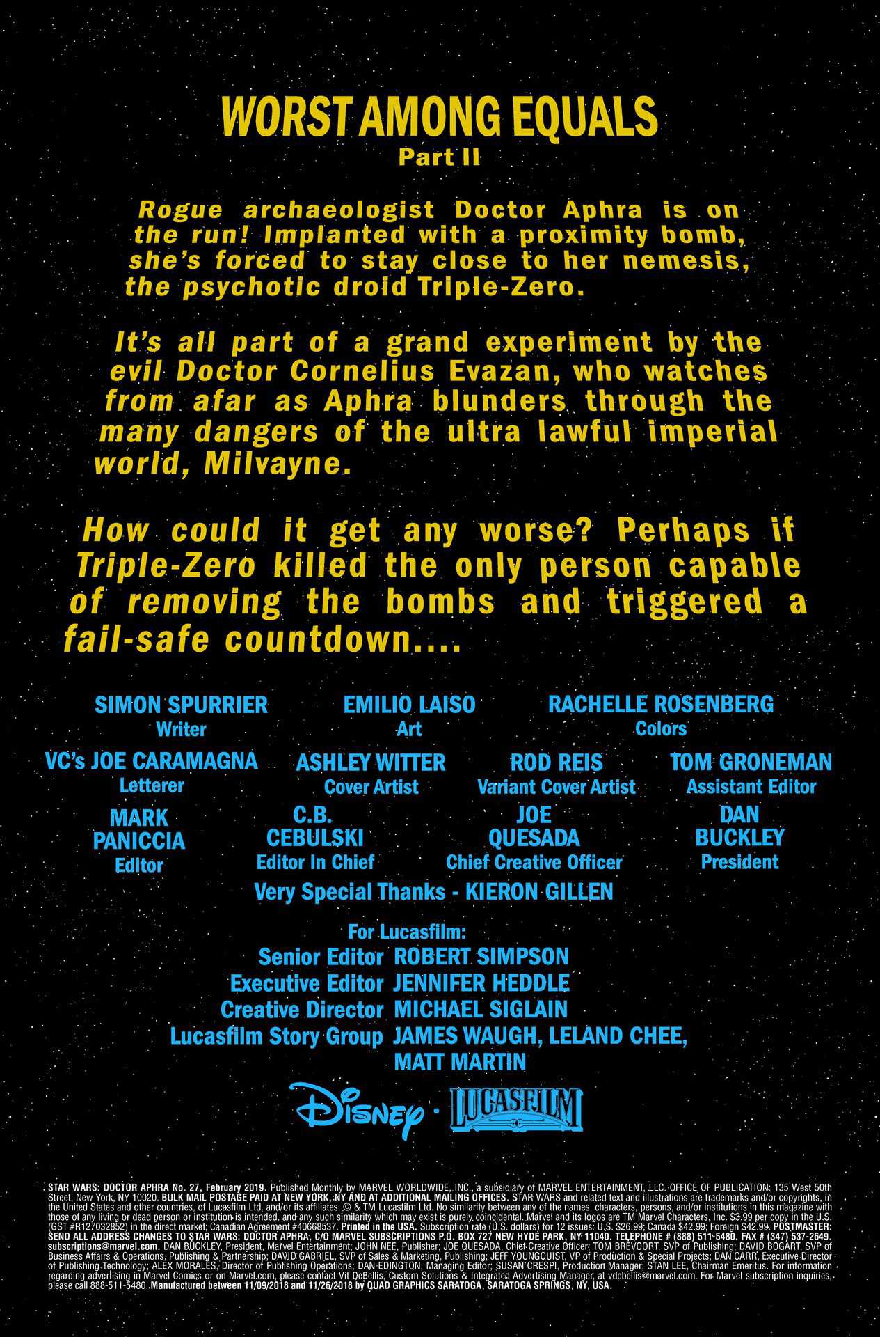 WORST AMONG EQUALS: PART TWO! Rogue archaeologist DOCTOR APHRA has ten hours to cross a hostile megacity before the bomb implanted in her throat blows up. No big deal, right? And even if there ARE, say, insane cops and bounty hunters on her tail—she’s got a partner to help her! (Unfortunately that would be TRIPLE ZERO: the astonishingly unpleasant murder droid who yearns to see her dead)