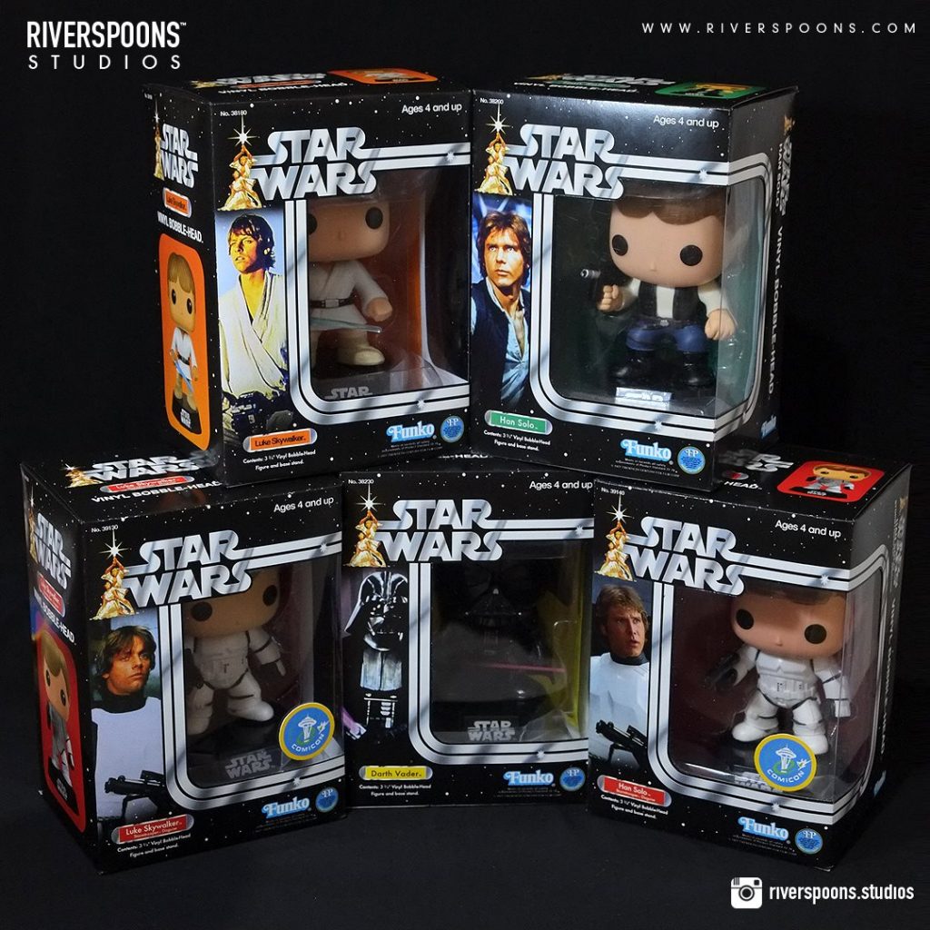 Custom designers Riverspoons Studios have taken these fantastic figures to the next level, with their Custom Funko POP! Star Wars Packaging. The packaging is very reminiscent of vintage Star Wars action figure packaging. Star Wars fans are going nuts online, to acquire these, but sadly Riverspoons Studios has no intention of selling these. They are strictly a concept design for now. You can check out even more of their fantastic photos at their official Facebook page.