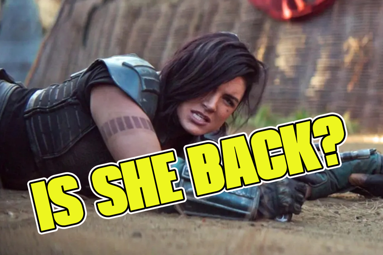 Gina Carano as Cara Dune in a tactical pose on the ground from The Mandalorian, with the text "IS SHE BACK?" overlaid in bold yellow letters.