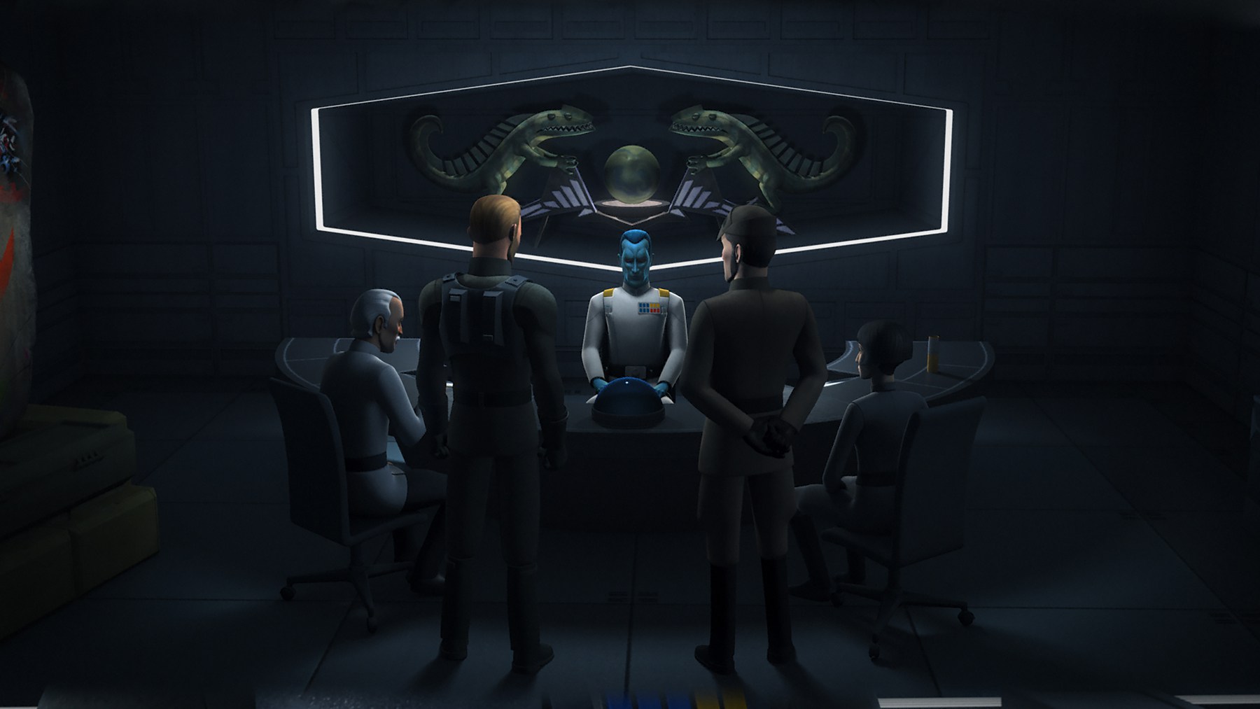 In this clip from the Star Wars Rebels episode “Through Imperial Eyes,” Grand Admiral Thrawn ratchets up the hunt for the rebel spy in their midst, codename Fulcrum.