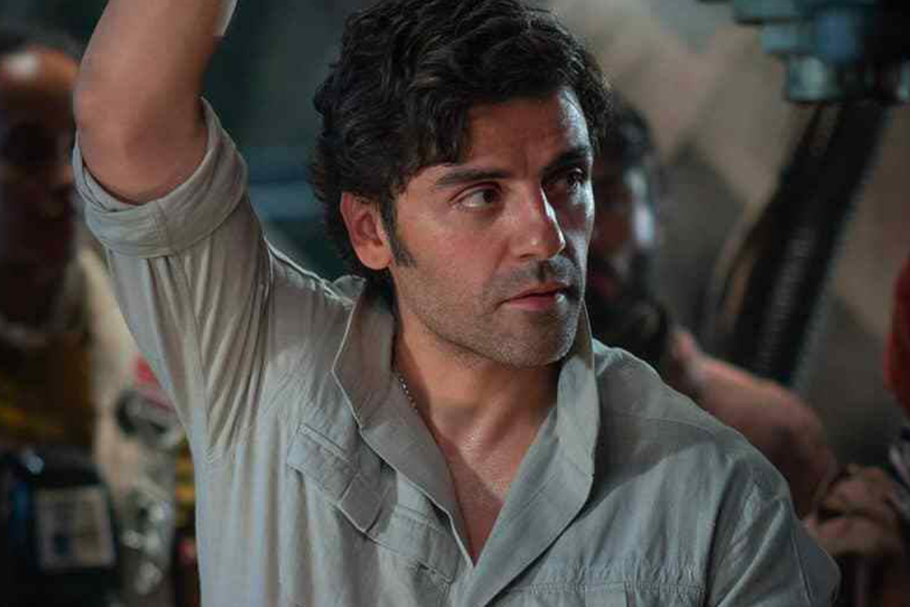 Oscar Isaac as Poe Dameron looking determined in a scene from the Star Wars sequel trilogy.
